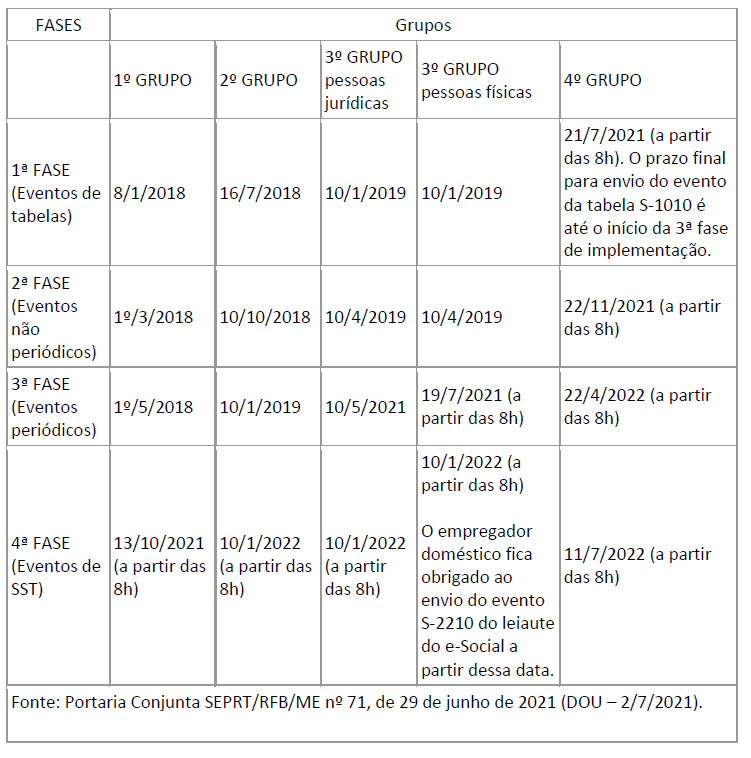 A migração para o e-Social está ocorrendo a partir de fases preestabelecidas. Segundo a portaria conjunta, na primeira fase devem ser enviadas as informações constantes dos eventos das tabelas S-1000 a S-1080 do leiaute do e-Social. Na etapa seguinte (segunda fase), o contribuinte precisa transmitir as informações constantes dos eventos não periódicos S-2190 a S-2420 do leiaute do e-Social. No entanto, não estão incluídos nesse conjunto de dados os eventos relativos à Saúde e Segurança do Trabalhador (SST).