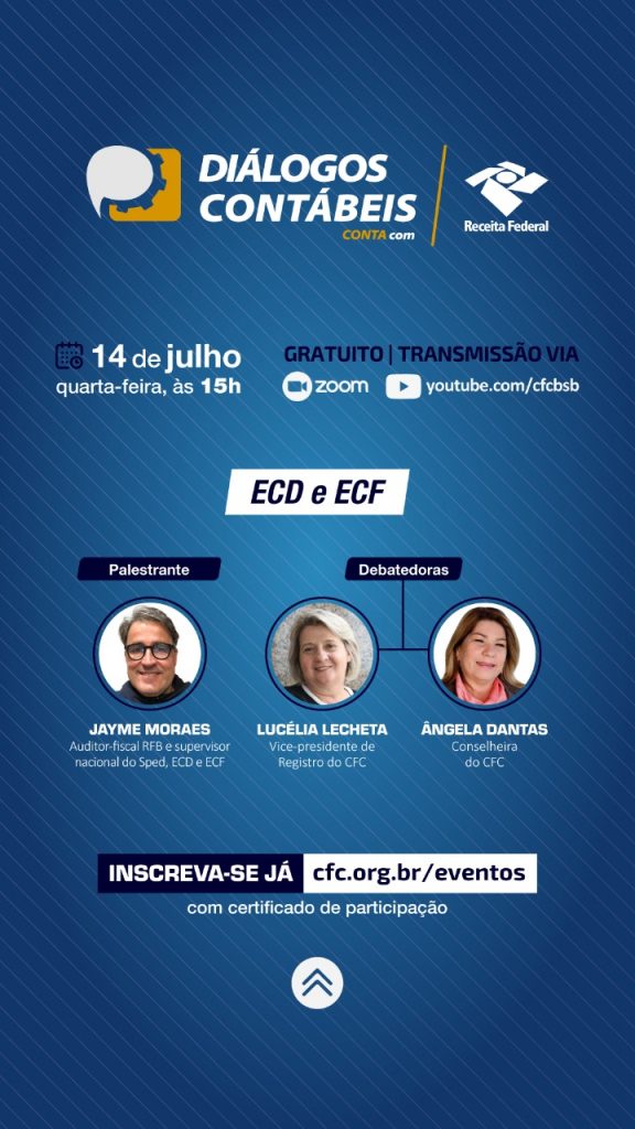 Para falar sobre essas escriturações, que estão com prazo de entrega previsto para o último dia útil deste mês, estará presente no evento o auditor-fiscal da Receita Federal do Brasil (RFB) e supervisor nacional do Sped, ECD e ECF, Jayme Moraes. A vice-presidente de Registro do CFC, Lucélia Lecheta, e a conselheira do CFC, Angela Dantas, serão as debatedoras do encontro.